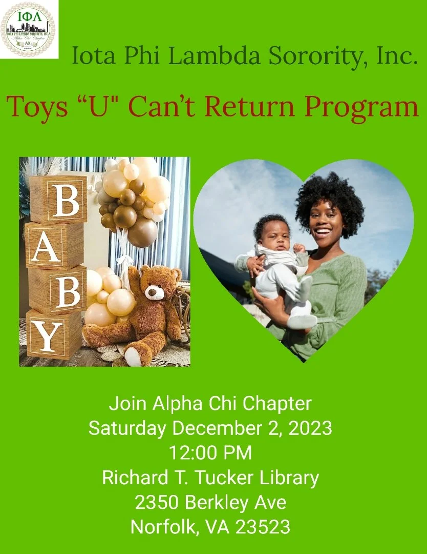 We are excited to invite you to the Toys "U" Can't Return event, Iota Phi Lambda's teen pregnancy prevention program. We are dedicated to supporting our youth and the program aims to focus on future career direction, realism about child rearing, personal life purpose, and self-value and knowledge. Please come hear from guest speakers and also representatives from the Norfolk Health Department and the Executive Director of Hearts Full of Grace.
